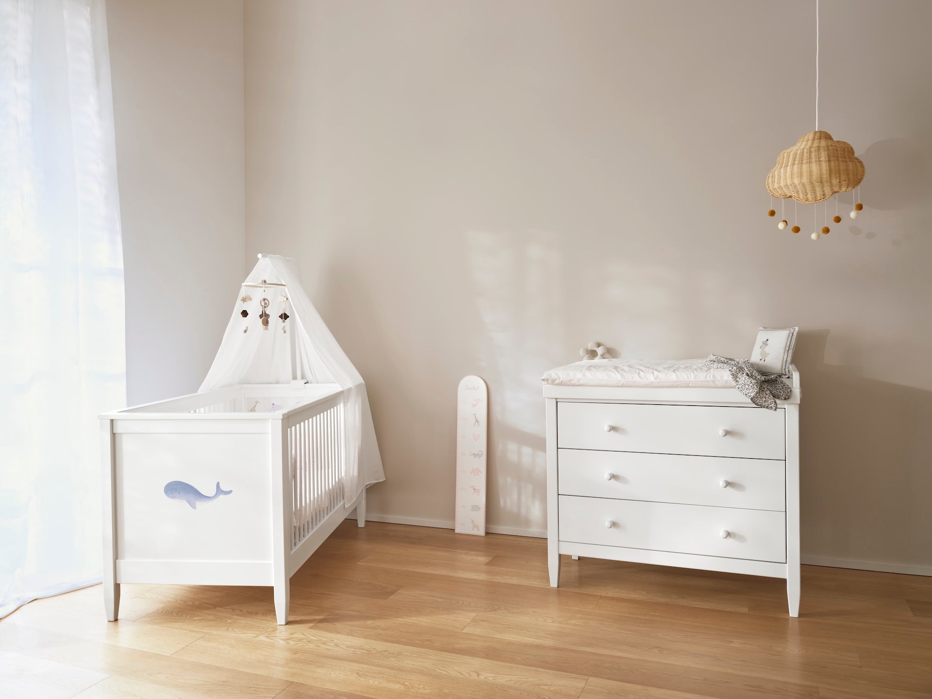 Our baby bed offers safety, comfort and a timeless design for a cozy and protected place to sleep. The rounded edges and optimally arranged bars ensure safety, while the height-adjustable slatted frame adapts the sleeping surface to your child's growing needs.