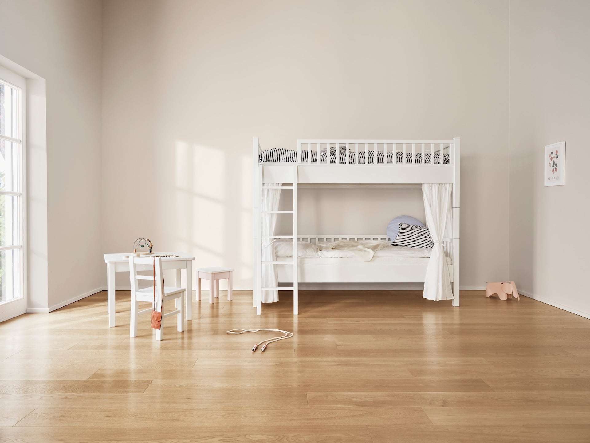 The bunk bed is available in white lacquered beech wood. Made from solid, certified wood, it impresses with its high quality and a clear, exclusive design. Thanks to the use of high-quality materials and a solid construction, the piece of furniture remains stylish and durable for many years.