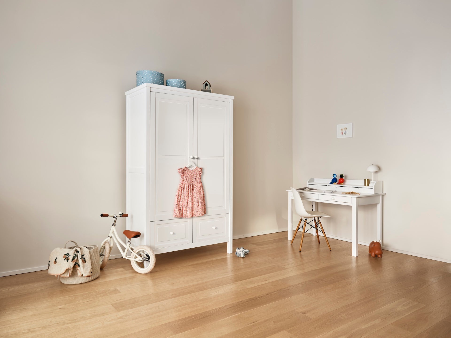Dieser Kleiderschrank ist nicht nur für die Aufbewahrung von Kleidung konzipiert, sondern auch flexibel genug, um den wachsenden Bedürfnissen deines Kindes gerecht zu werden. Die verstellbaren Einlegeböden und die durchdachte Innenaufteilung ermöglichen es, den Schrank im Laufe der Jahre an die sich ändernden Anforderungen anzupassen – sei es für mehr Platz für Schulsachen, Sportausrüstung oder Spielsachen. Gefertigt aus massivem, zertifiziertem Holz, besticht es durch seine hohe Qualität und ein klares, exklusives Design. Dank der Verwendung hochwertiger Materialien und einer soliden Bauweise bleibt das Möbelstück über viele Jahre hinweg stilvoll und langlebig.